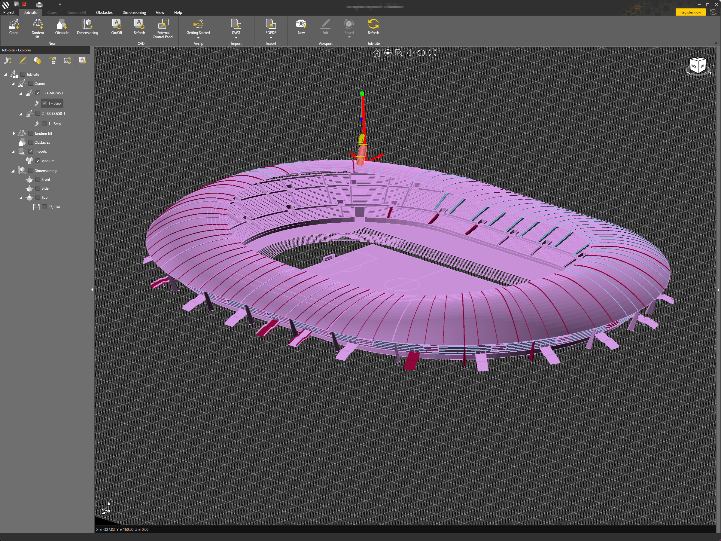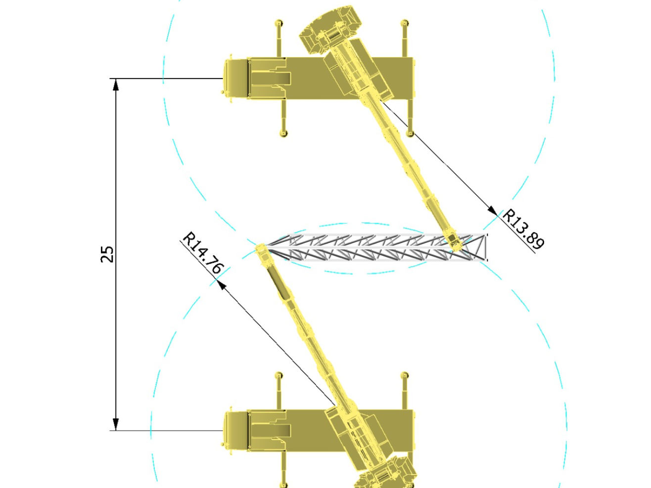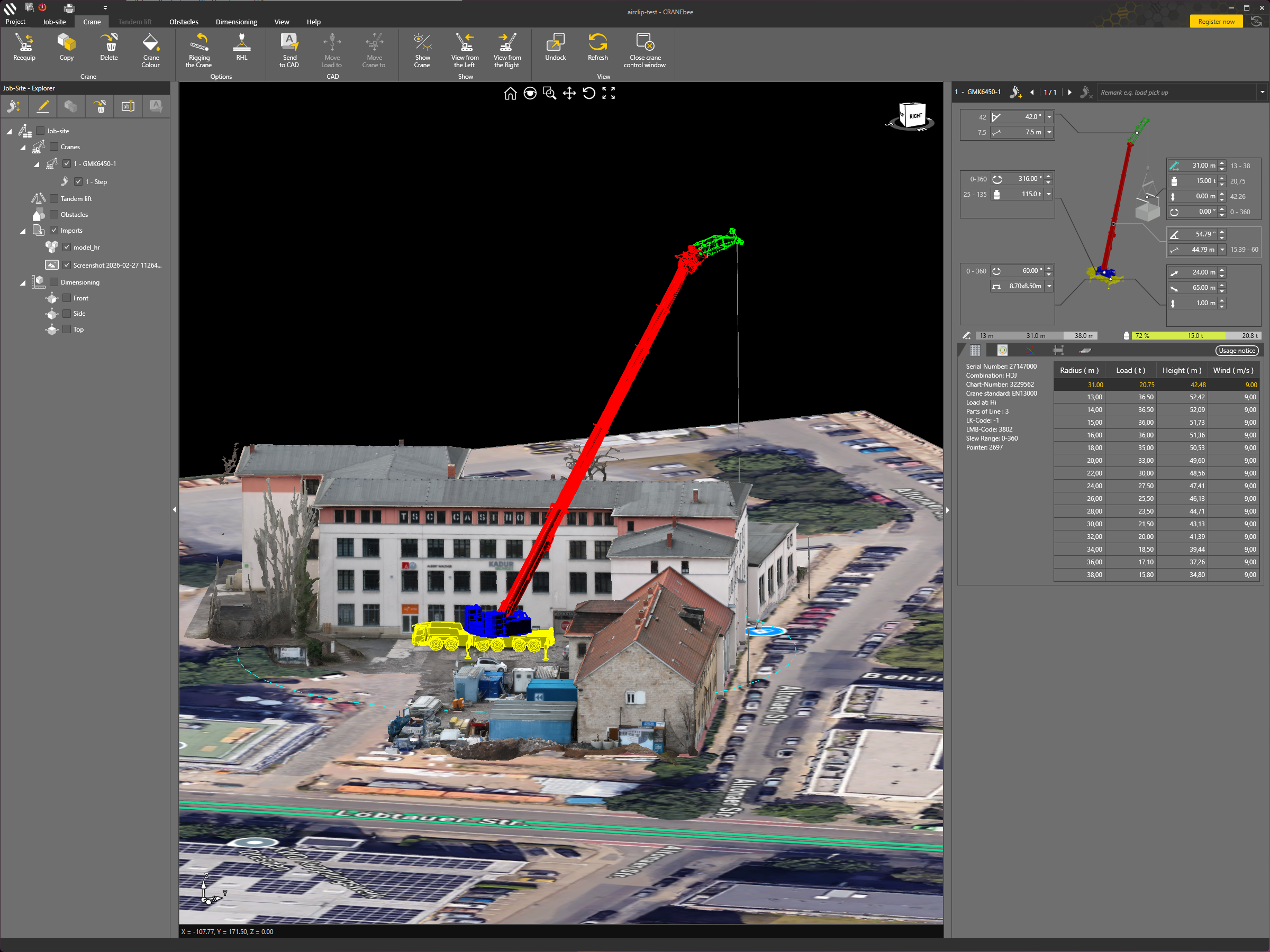 Einzelne Krane oder die gesamte Baustelle lassen sich per Klick übertragen. Änderungen in CRANEbee werden sofort in AutoCAD sichtbar. Zwei Systeme, ein Planungsstand.